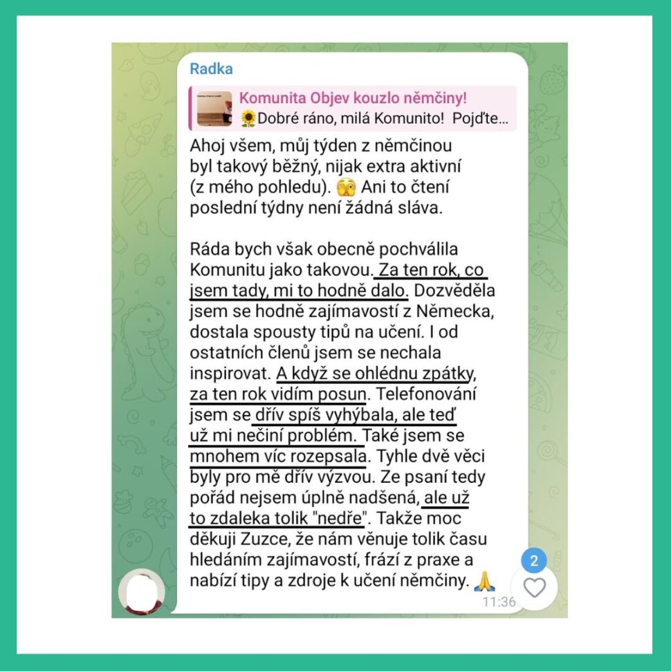 Připravila jsem pro vás prostor, který je výjimečný v tom, že se v něm s malou časovou investicí, po malých jednohubkách a hodnotných tréninzích věnujeme nejen němčině, ale i efektivnímu učení a reáliím života v Německu. Navíc své zkušenosti, zážitky, objevy atd. můžete sdílet s lidmi, kteří jsou v němčině také na cestě za svým cílem. Dostanete tak pravidelnou dávku jazyka, kultury i tipů na učení, které vás udrží motivované a fokusované, ale i odvážné a plné chuti jít dál a dál. Díky naší komunitě porostete nejen v němčině, ale i ve svém životě.