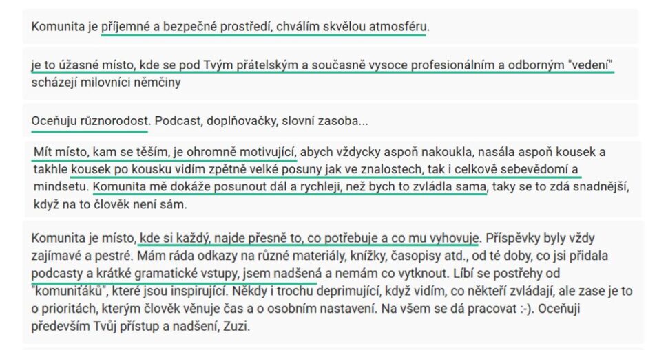 Abysme neztráceli motivaci a nechtěli němčinu vzdát, je důležité se ocenit za každý sebemenší pokrok, který se nám podařil. Ale upřímně: kdo z nás se skutečně dokážeme poplácat po rameni? Většinou se spíš na sebe zlobíme, že jsme se neučili, že jsme dělali chyby atd. Proto máme v Komunitě Chválící neděle. Jsou tu od toho, abyste mohli posdílet se mnou a ostatními lidmi, kteří jsou stejně jako vy na cestě za svým snem dokázat komunikovat v němčině, co se dařilo a kde to dřelo. Můžu vám slíbit, že se vám od nás dostane přesně to, co potřebujete - uznale vás poplácáme po rameni, necháme vás se vyzlobit nebo se společně vyhecujeme jít dál a nevzdávat se.