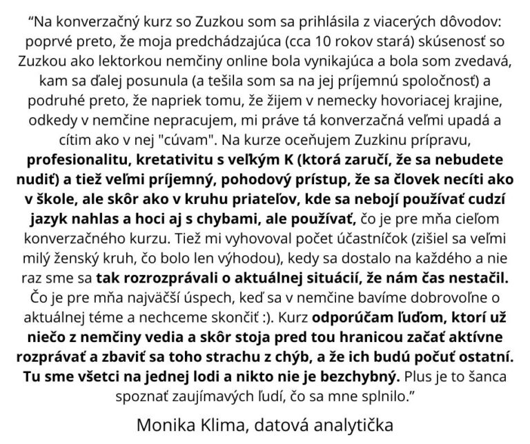 ✅ Úplně nový druh sebevědomí při mluvení v němčině - Už po 8 týdnech pravidelného každodenního psaní a mluvení ucítíte, jak se vám věty tvoří s mnohem větší lehkostí a nastartujete v mluvení úžasné momentum, které už nebudete chtít jen tak pustit.
