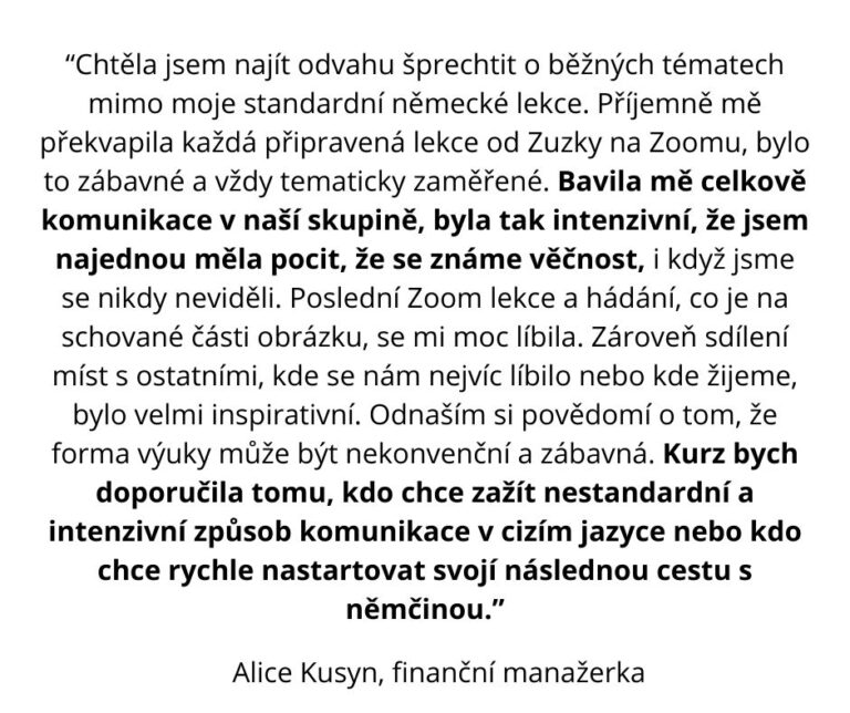 ✅ Součástí intenzivní verze kurzu je každý týden navíc 30min živé konverzace na zoomu v malé skupince. (O termínech pravidelných půlhodinek se domluvíme před začátkem kurzu tak, aby vám časově vyhovovaly.)