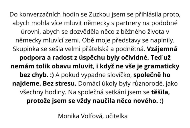 A funguje to. Lidé, kteří se roky báli mluvit, najednou posílají hlasovky, reagují spontánně a poprvé od nich slyším větu: „Už se mluvit německy tolik nebojím!“ Wow!🎉