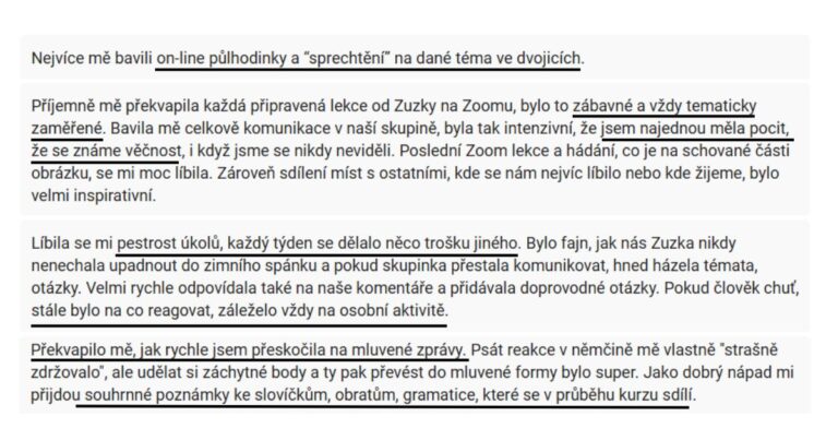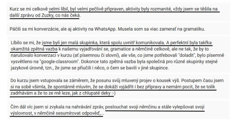 Jak na konverzační půlhodinky, tak i na vaše hlasové a textové zprávy vám dám každý týden zpětnou vazbu -  na gramatiku, slovní zásobu i výslovnost do sdíleného anonymního dokumentu. Z něj pak můžete čerpat důležité informace a inspiraci nejen pro následné hlasové či textové zprávy.