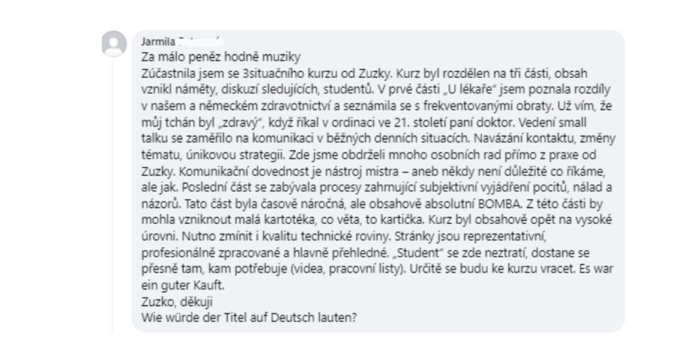 A právě proto jsem pro vás vytvořila tento situační videokurz. Po jeho absolvování si budete jistí, že nemusíte své pocity ani názory tzv. polikat, protože je nedokážete v němčině vyjádřit. Osvojíte si hromadu šikovných obratů, které vám dají odvahu, jistotu a sebevědomí říci, jak se cítíte či co si myslíte.