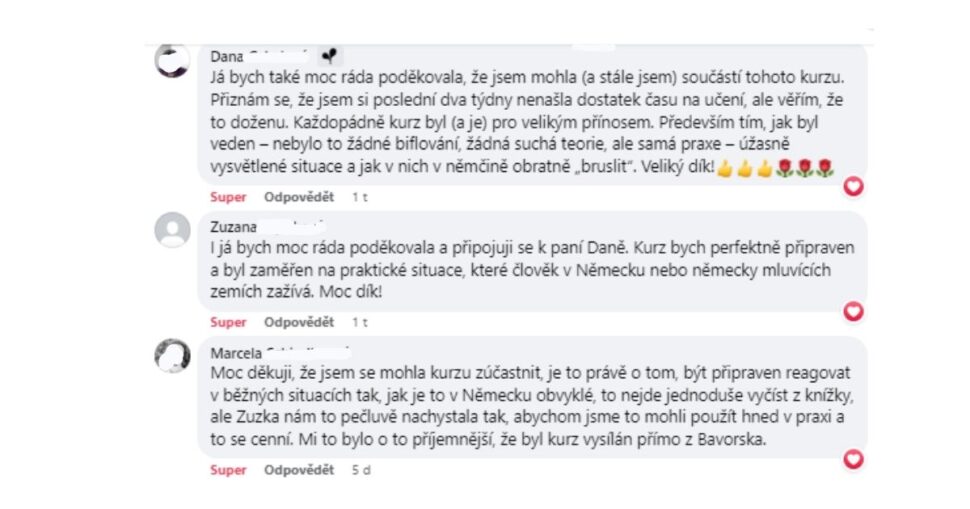 Při tvorbě tohoto videokurzu jsem vycházela ze základních 7 emocí a podívala jsem se na to, jak je lidé tady v Německu vyjadřují. V tématu vyjadřování názorů jsem pak vycházela nejen z praxe, ale i z nerůznějších tréninků komunikace, kterými jsem jako lektorka, učitelka a pedagožka prošla.